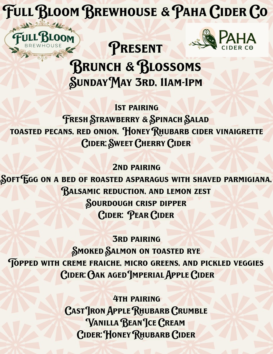Join us for Brunch and Blossoms as we welcome our friends from Paha Cider in Waverly, IA. Enjoy four delicious courses paired ciders.