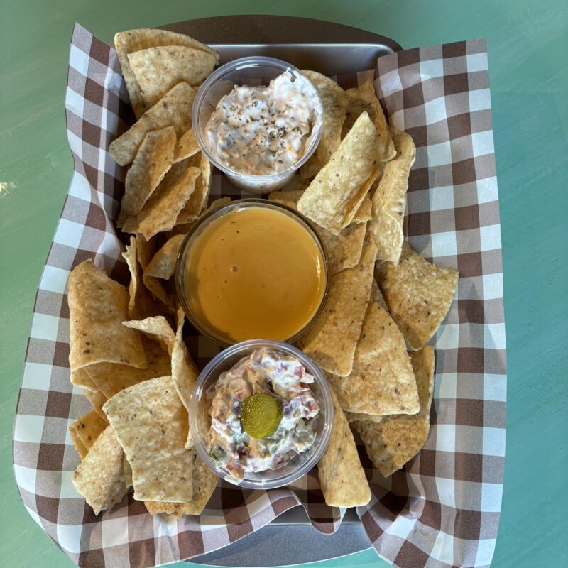 Barn Tin beer cheese, chunky salsa, and bacon cheddar ranch dip all served with tortilla chips.