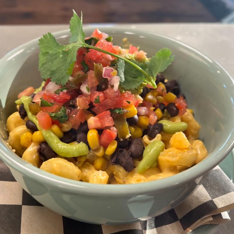 Creamy Mac and cheese bowl piled high with fresh pico, black bean and roasted corn relish, and topped with avocado cream. Add smoked pulled pork for an additional 3.64