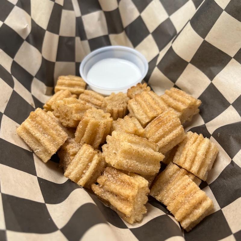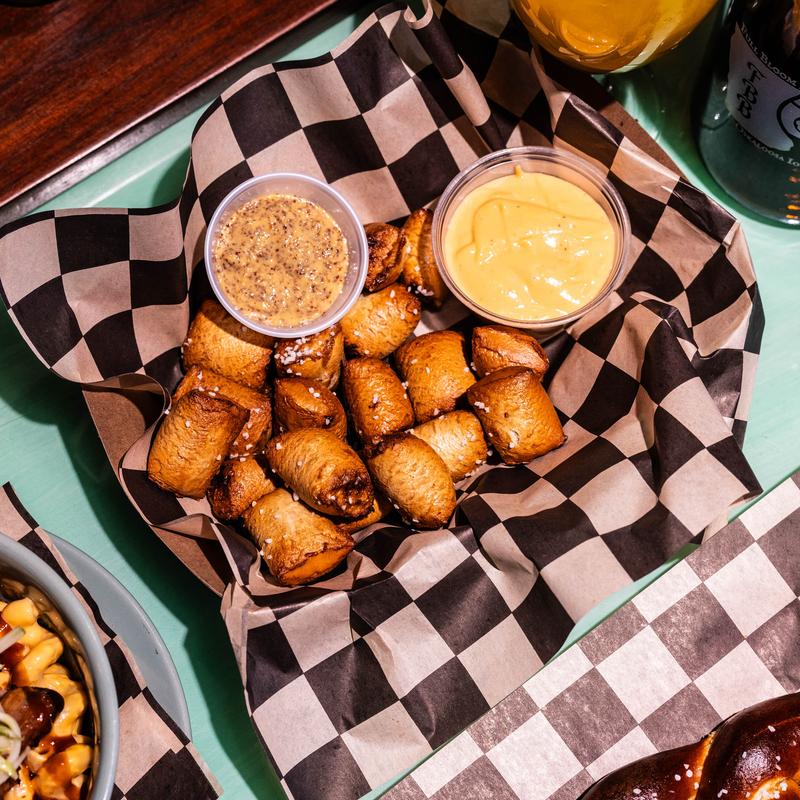 Soft pretzel bites paired with warm Barn Tin beer cheese and zesty stoneground mustard.