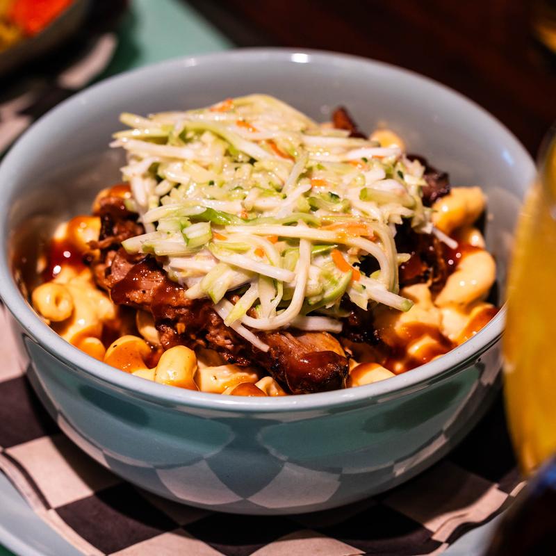 Creamy Mac and cheese topped with smokey BBQ pulled pork, BBQ drizzle, and sweet apple broccoli coleslaw.