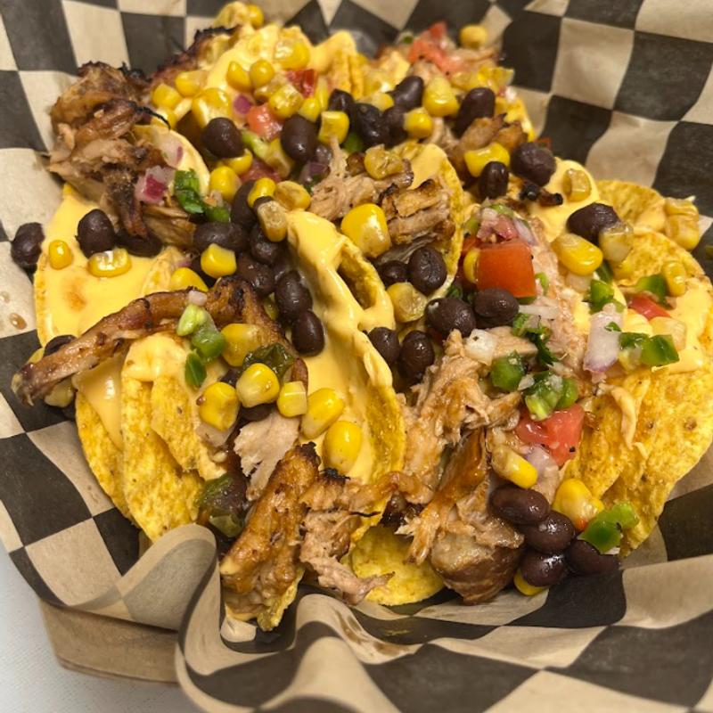 Tortilla chips topped with house smoked pulled pork, beer cheese, black beans, roasted corn, and fresh Pico