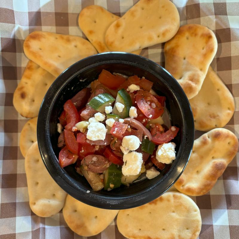 A creamy whipped feta dip, finished with a topping of Greek-marinated olives, garlic, tomatoes, and cucumbers, all drizzled in a flavorful feta Greek dressing.
