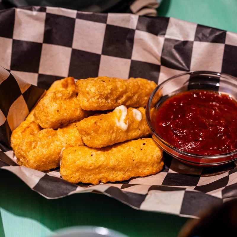 Crispy, golden-breaded mozzarella sticks baked to perfection, served in six pieces with a side of marinara dipping sauce.